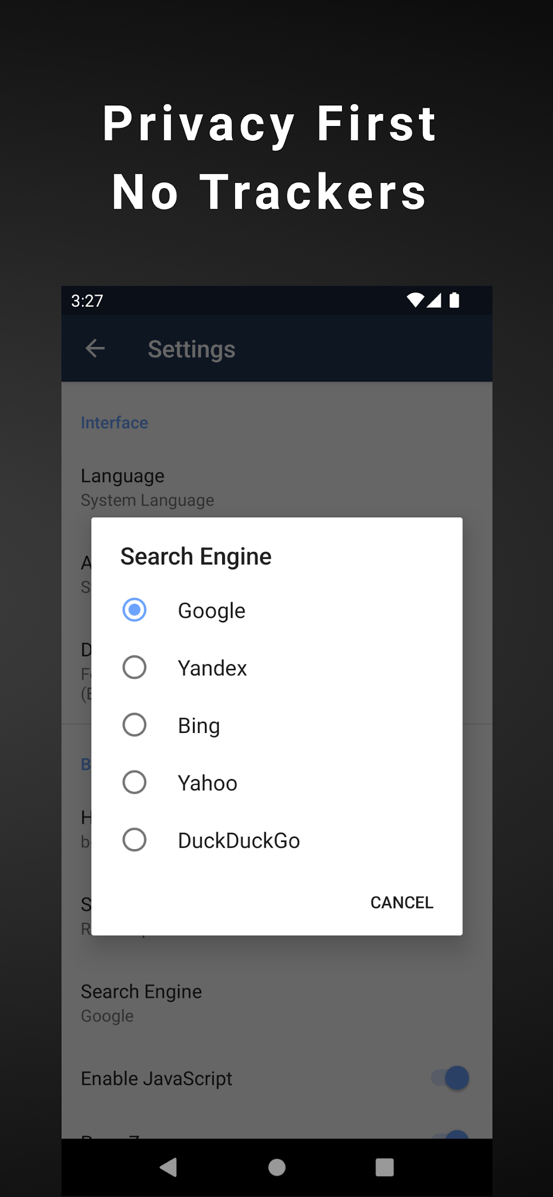 Using Bolt Mini: Fast Web Browser, switch search engines according to your preference. We provide Google Search, Yahoo Search, Yandex Search, DuckDuckGo Search and Bing Search.