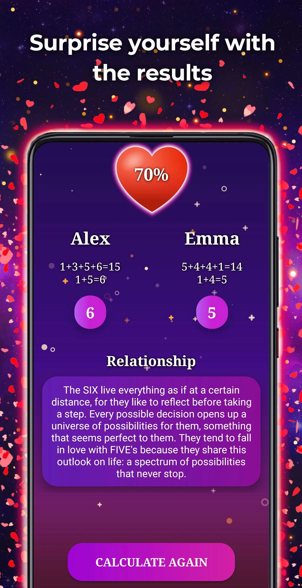 Running Love Calculator - Love Test on your computer allows you to browse clearly on a large screen, and controlling the application with a mouse and keyboard is much faster than using touchscreen, all while never having to worry about device battery issues.