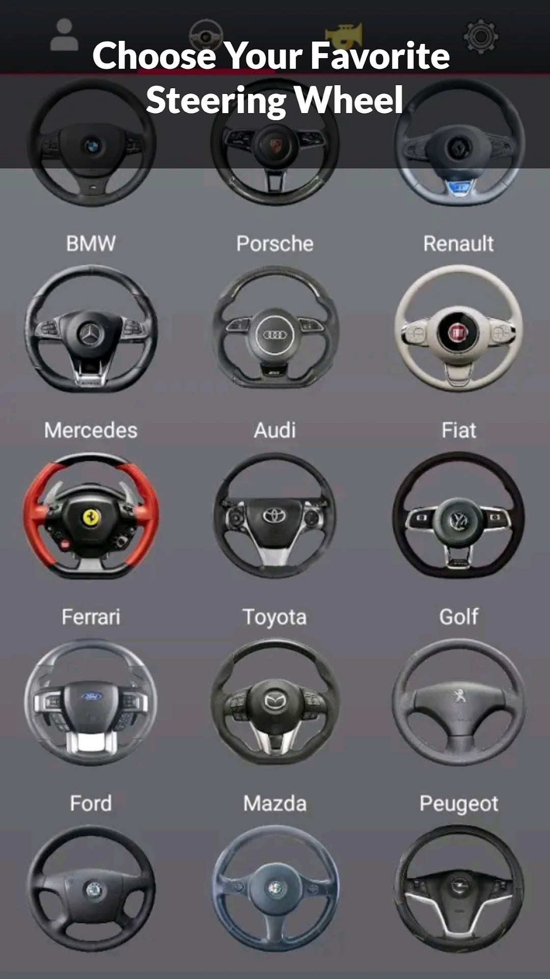 - Various types of car steering wheels.
