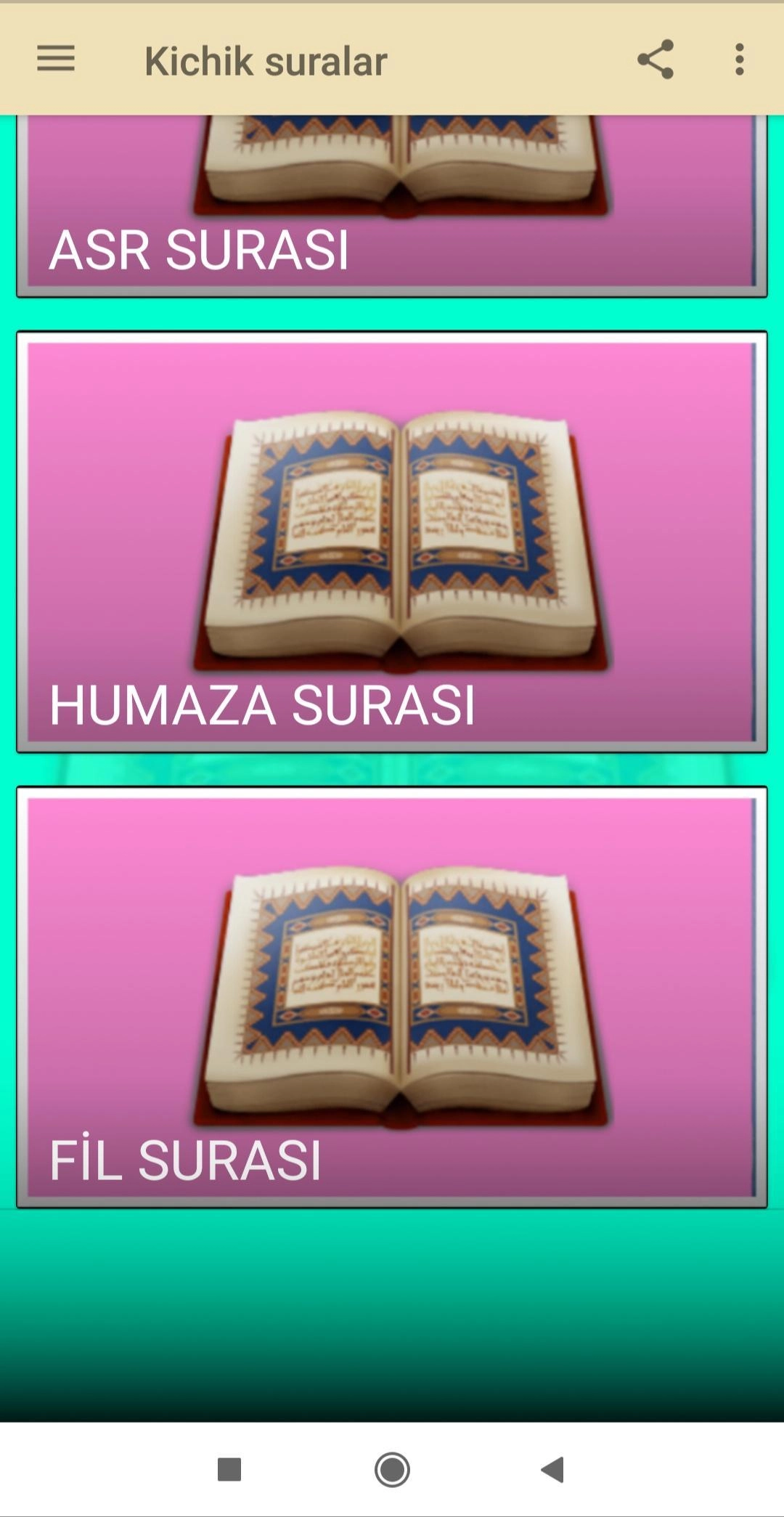 Qur'ondan Kichik Suralar is a Books&Reference application developed by Androazeri (Nural İsmayilov), but with the best Android emulator-LDPlayer, you can download and play Qur'ondan Kichik Suralar on your computer.