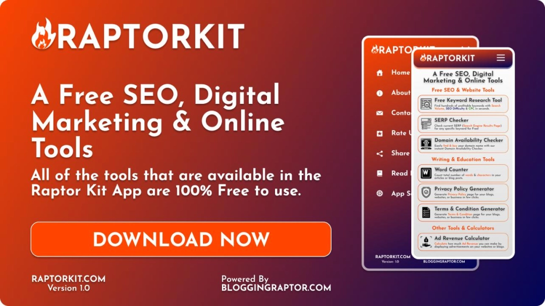 Download RaptorKit - SEO & Online Tools and run it on your PC. Enjoy the large screen and high-definition quality on your PC!
