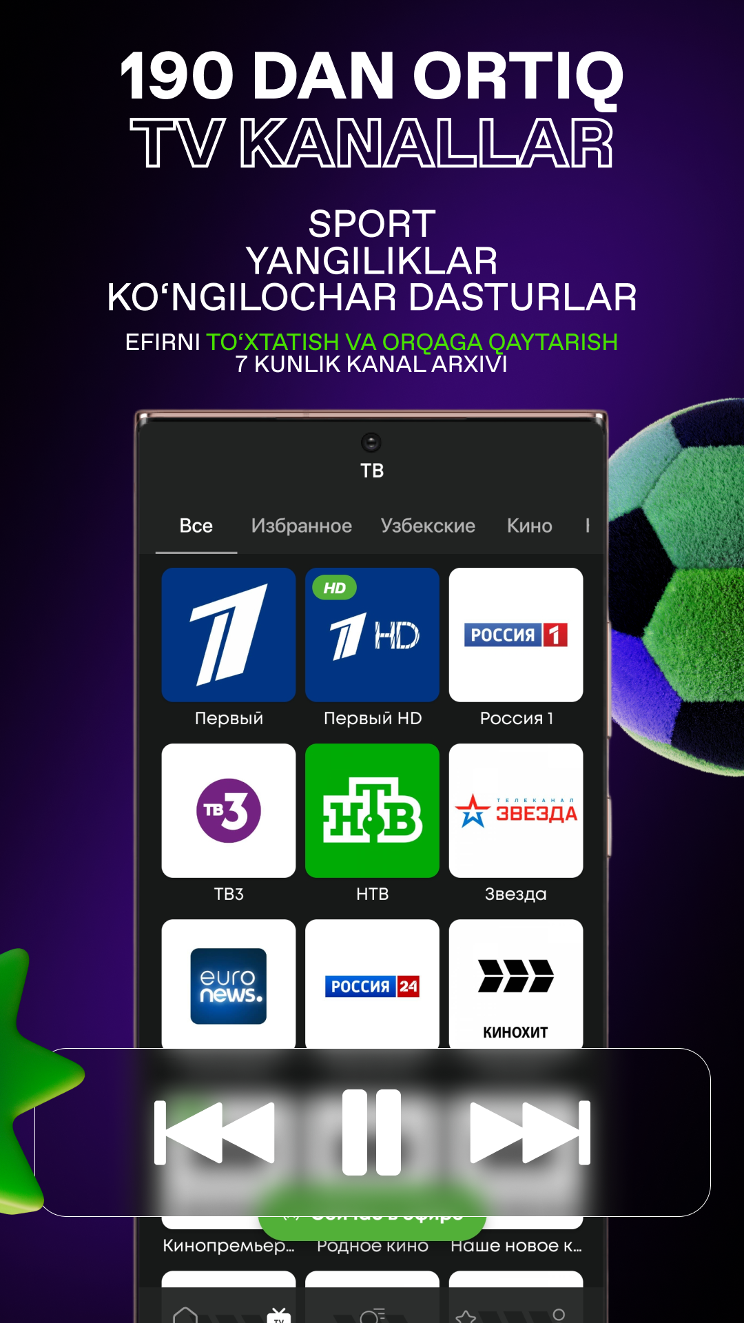 📡 180+ Telekanallar: Первый, BBC, Euronews, ZOR TV, Sevimli, Milliy, My5, Sport TV, Setanta va boshqalar