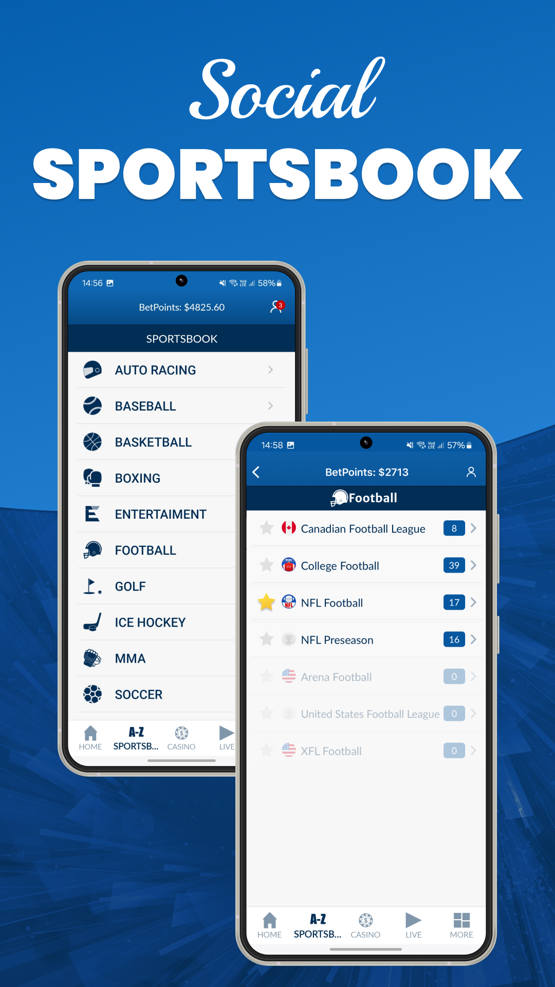 Experience the thrill of social Sport Betting™ on ALL MAJOR SPORTS including Football, Baseball, Basketball, Hockey, UFC, Soccer, Tennis, Golf, Boxing, Racing and more. The original social Sports Betting™ App brings you real time Las Vegas Odds, multiple betting options (Parlays, Straight, Teasers and Player Props) and even Live Betting all Game Long.Bet Nationwide on all your favorite games including Live In-Play Betting on all major sporting events. Bet safe & secure with no deposits or fees required to play! Las Vegas never sleeps and neither does our Sports Betting™ offering.