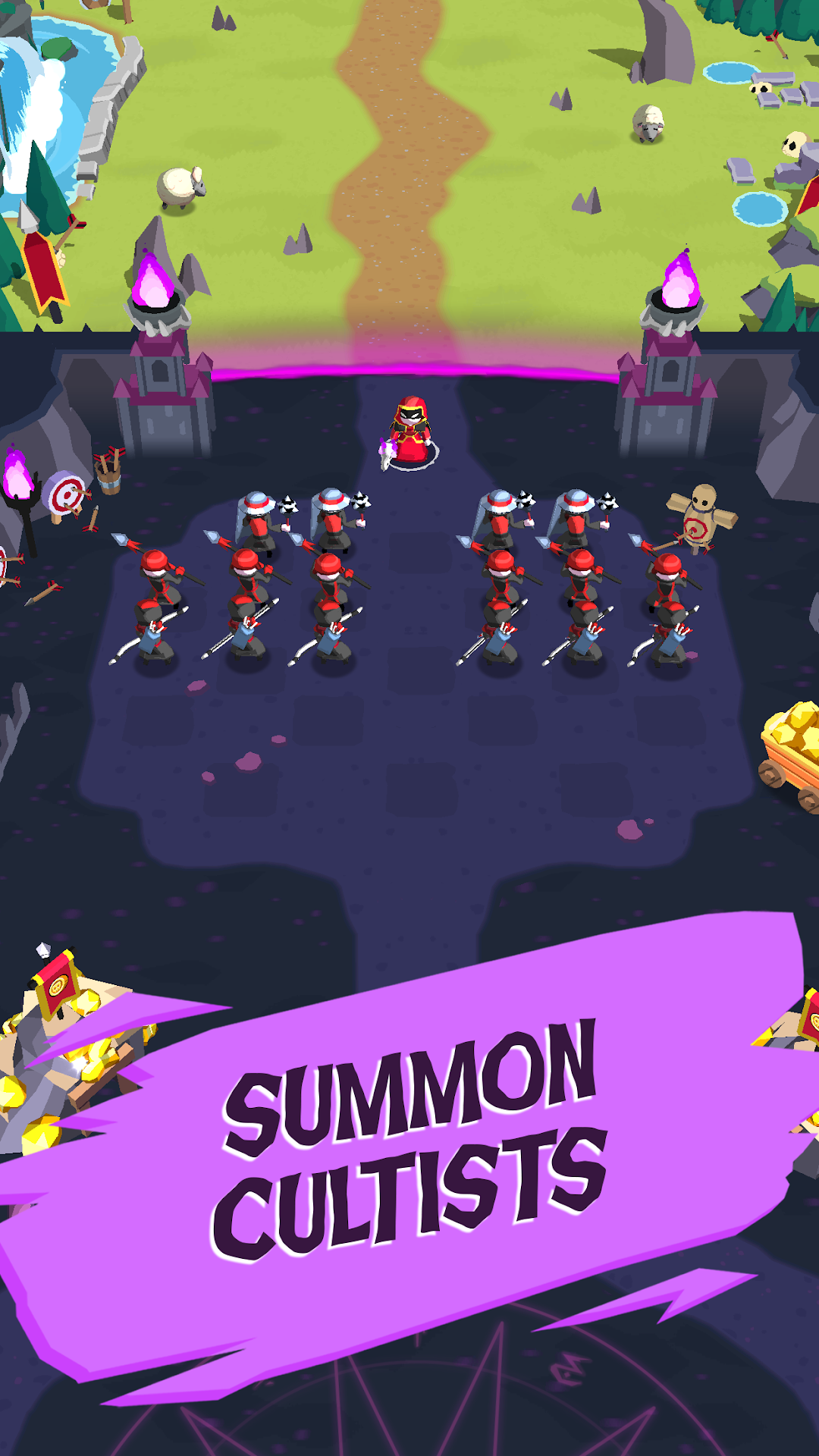 Observe the enemy, build the best formation, and destroy the opposing cult’s cauldron.- Summon melee and ranged units to fight for you.