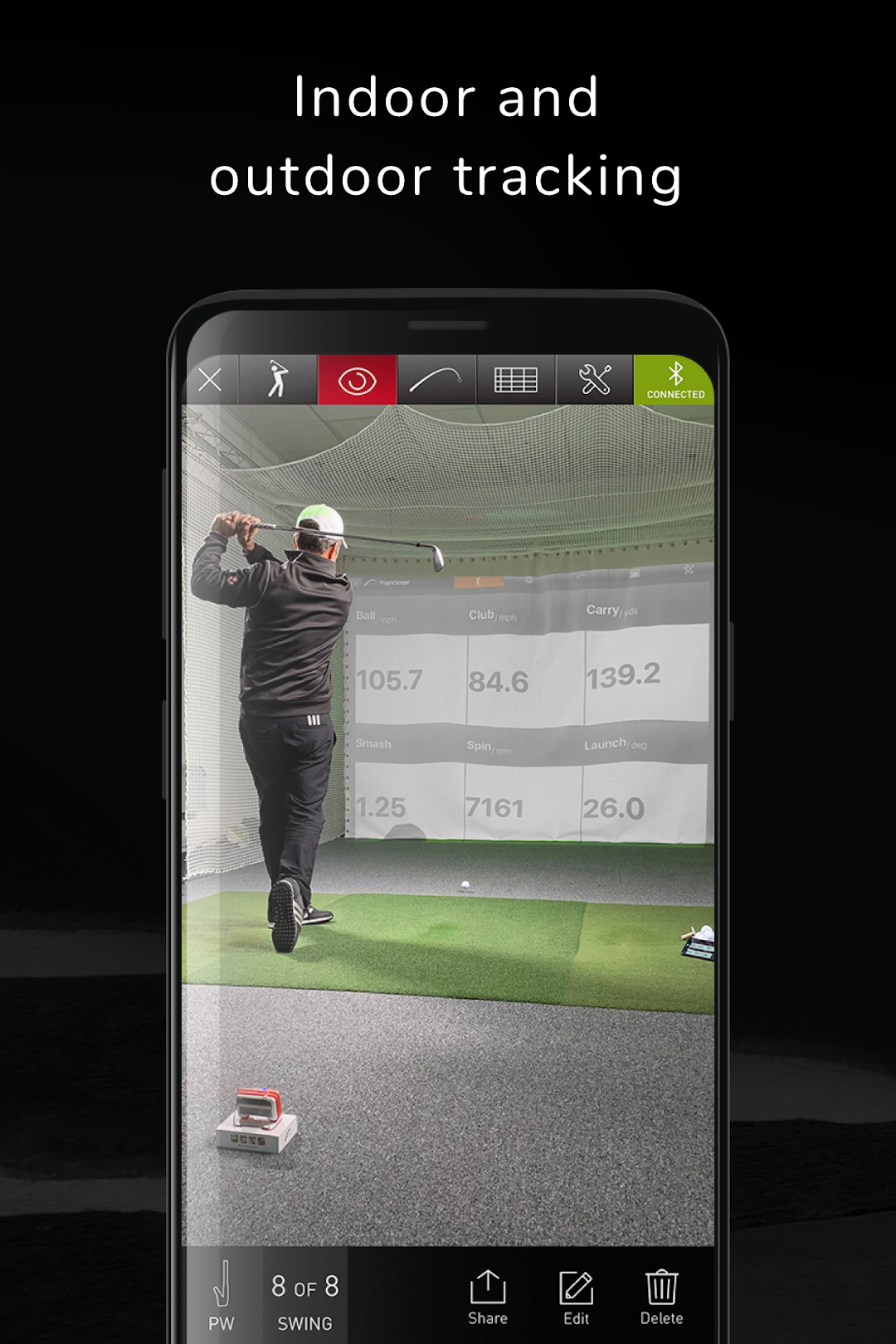 - Data available:Ball speed, club speed, smash, vertical launch angle, carry distance, spin rate