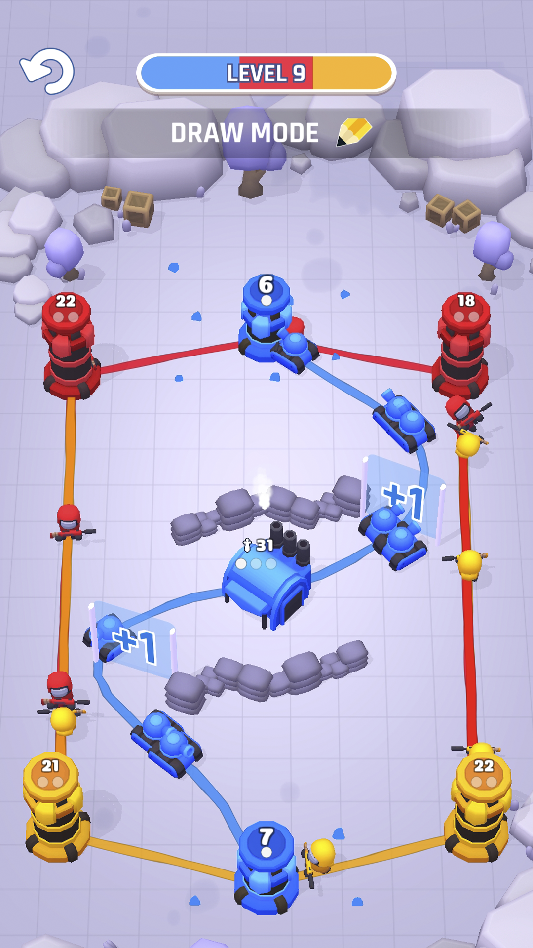 🖍 Interference on the line: It’s not just enemy troops you’ll have to contend with, the field of battle is littered with other obstacles and features, including dangerous mines, tough barricades, and portals that can increase or decrease the number of soldiers going through them.
